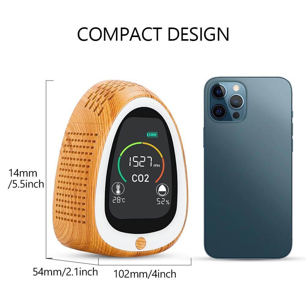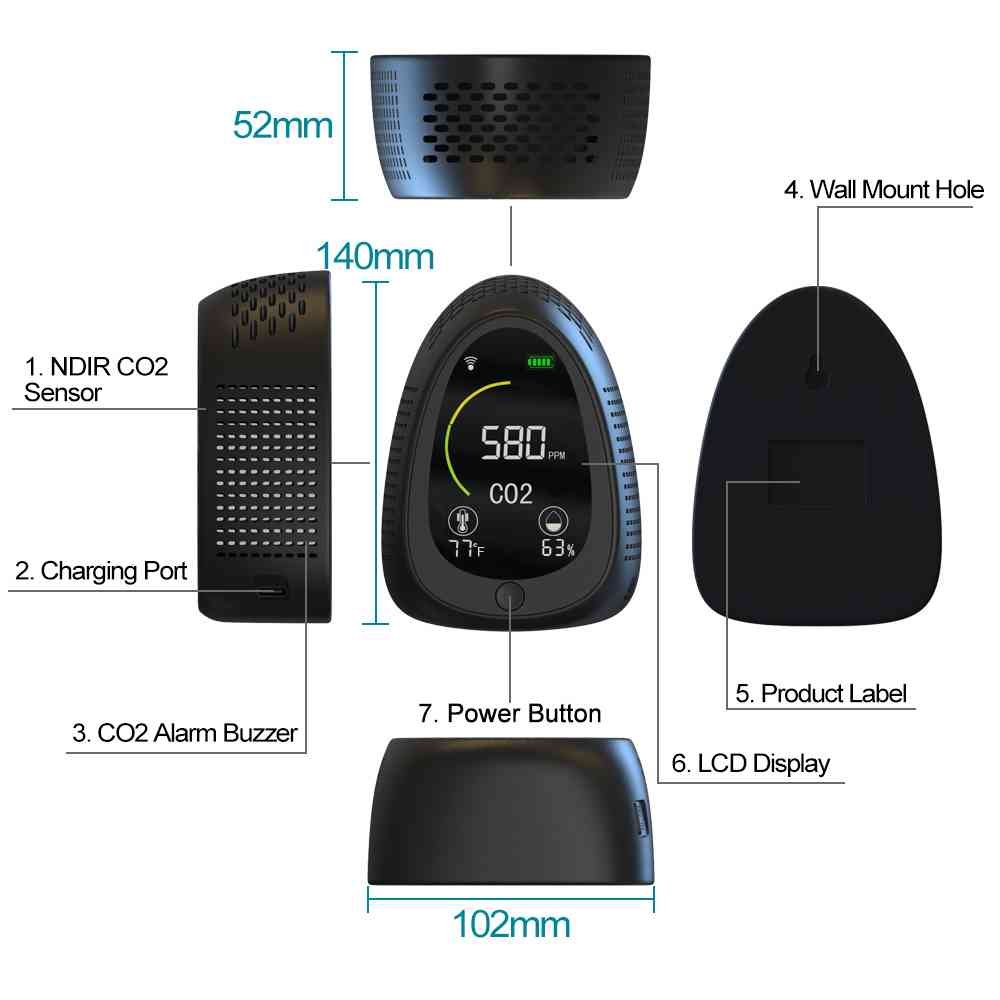 Ги мери следните параметри: Јаглерод диоксид (СО2), влажност и температура на воздухот и Аларм за чад (Smoke Alarm). Нема Wi-Fi конекција (не може измерените вредности да се гледаат на апликација на мобилен телефон или персонален компјутер – by smart app).